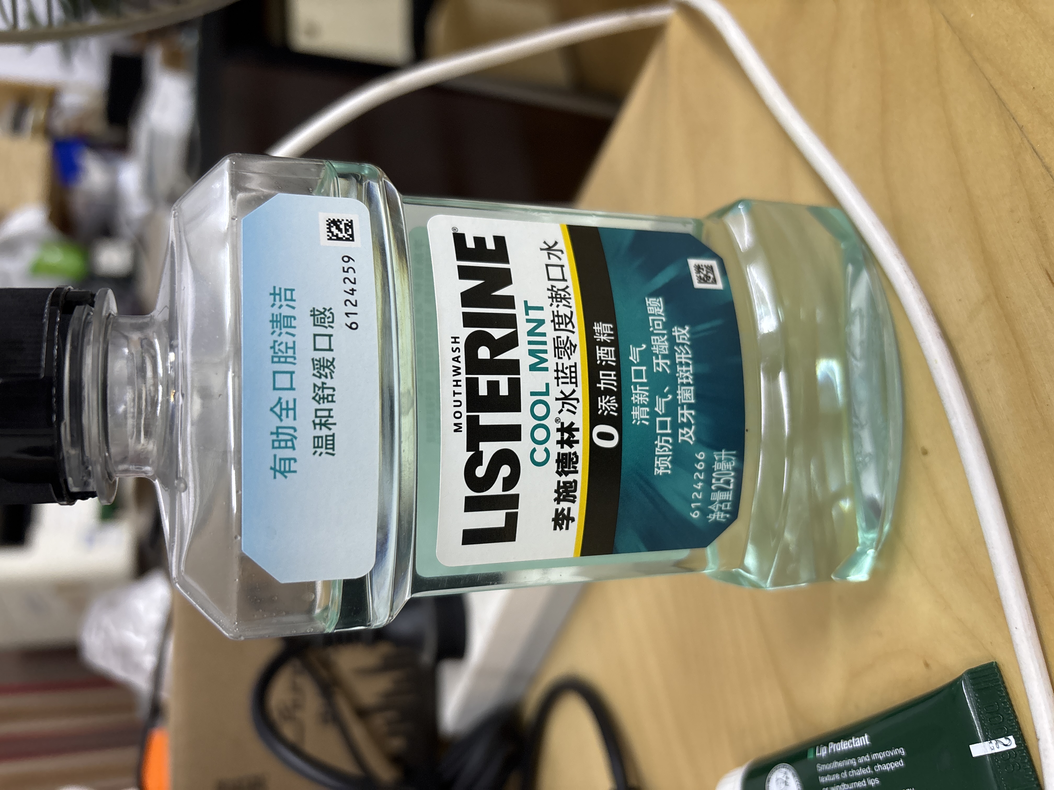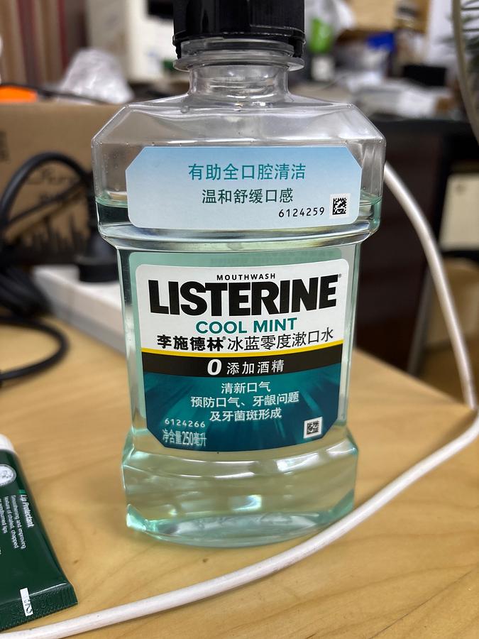 You're looking at a product that's very common around the world, but this particular version has a detail that stands out to someone used to Western products: the emphasis on being alcohol-free. While Listerine's "Cool Mint" flavor is universally recognized, here in East Asia, you'll often find prominent labeling highlighting the "0% Alcohol" content.