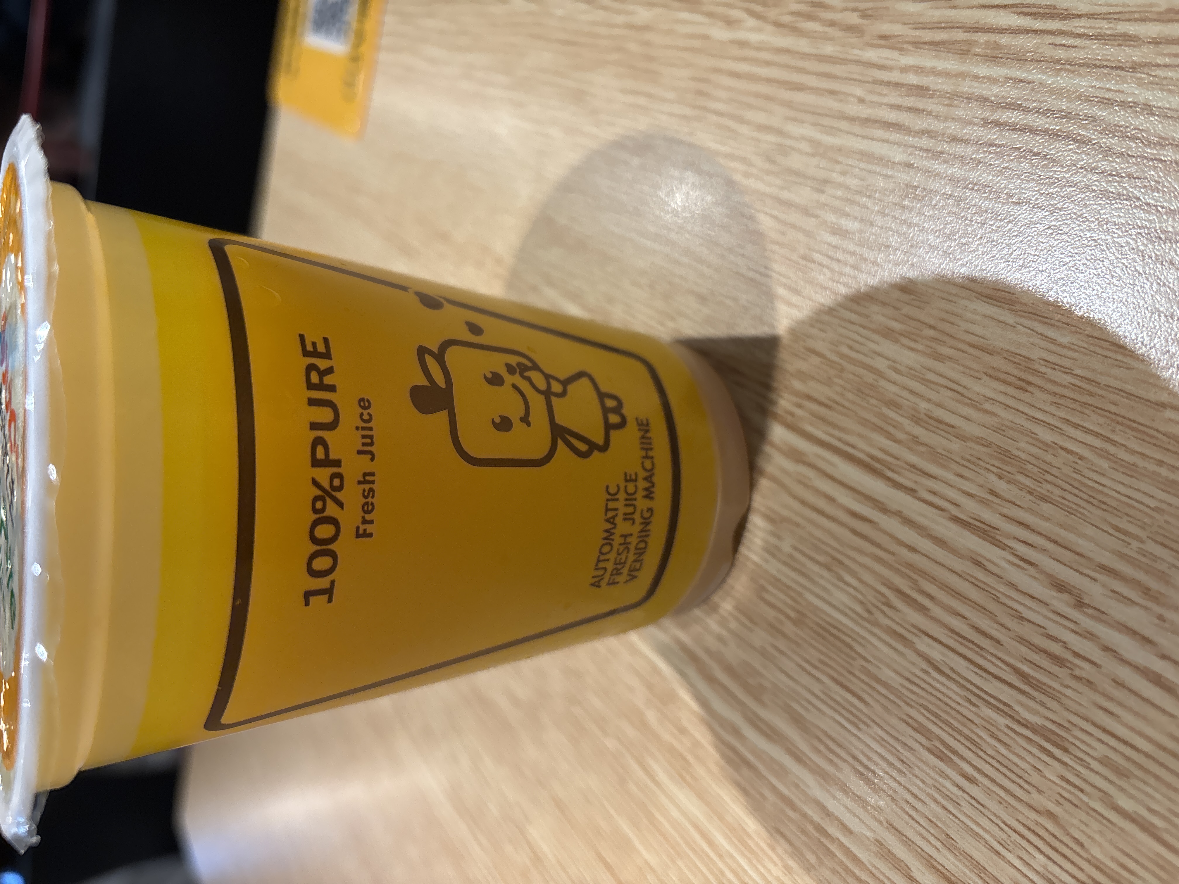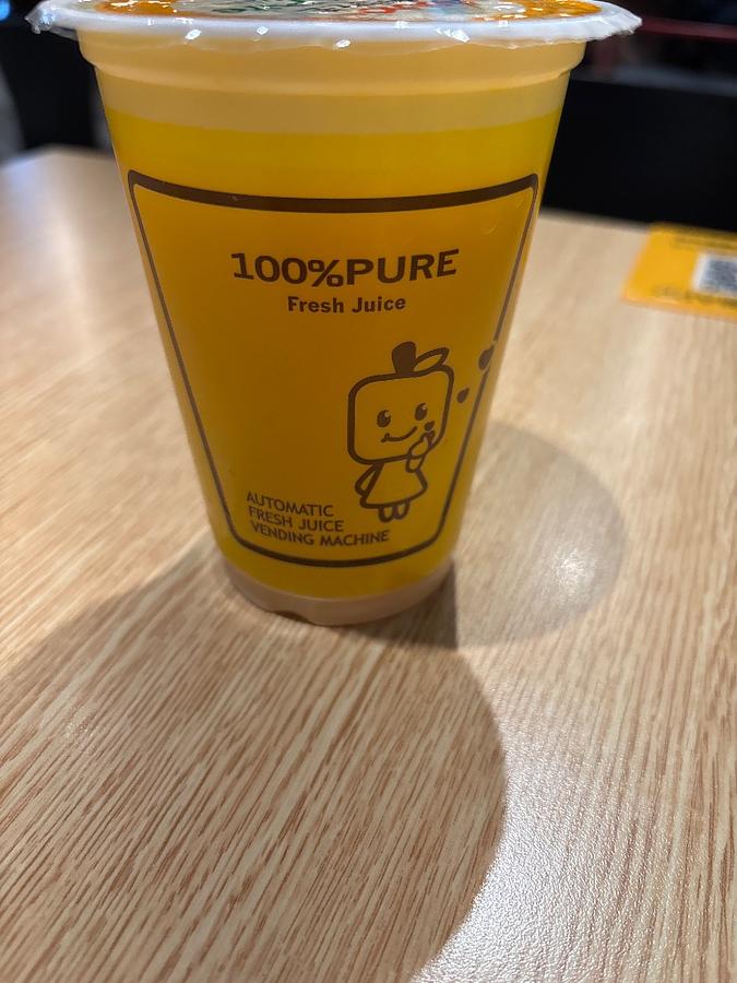 This appears to be fresh juice from an "automatic fresh juice vending machine." These machines have become increasingly common in China, especially in larger cities. They often use whole fruit, like oranges, which are squeezed on demand directly into your cup, providing a truly fresh and often pulp-rich beverage. This offers an alternative to pre-packaged juices or juice bars, emphasizing convenience and freshness.